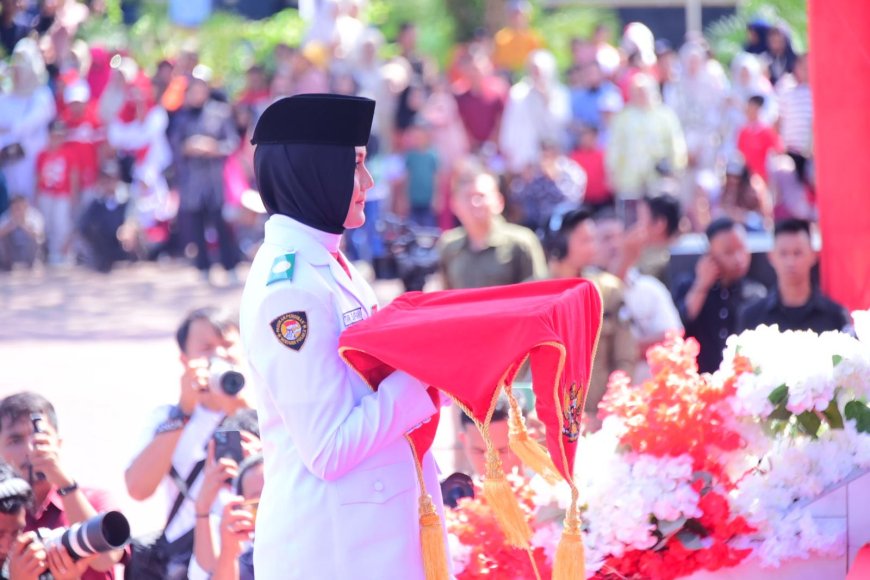Bupati Kasmarni menyerahkan bendera Merah Putih Untuk Dikibarkan Kepada Pembawa Baki Tiara Safiani SMK Negeri 1 Siak Kecil
