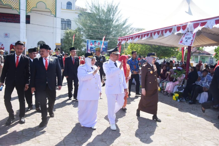 Bupati Bengkalis Kasmarni, Wakil Bupati Bagus Santoso saat menuju lokasi upacara HUT RI ke-80 Di Bengkalis